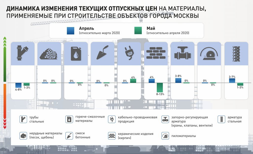 «В секторах нерудных, горюче-смазочных материалов, бетонных смесей и пиломатериалов изменений не выявлено. По сравнению с апрелем, в мае на 8-13% снизилась цена на керамические изделия – такие как кирпич. Также от 1% до 3% упала стоимость арматурной стали и стальных труб. Рост показателей отмечен только в части кабельно-проводниковой продукции», –сказал Евгений Шмагин.