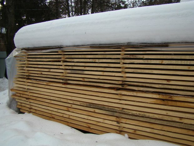 Древесина естественной влажности укладывается на подставки в штабель, а между этими подставками обязательно оставляют расстояние, чтобы между слоями досок шло продувание. Если нет возможности поставить над досками или брусом навес, то пиломатериалы надо закрыть пленкой или другим влагоизолирующим материалом (например, подойдет брезент), однако обязательно продумать вентиляцию. Перед тем, как оставить ваш лес на зиму, проверьте качество обработки древесины: если найдете где-нибудь кусочек коры — обязательно снимите, чтобы под ним дерево не загнило.